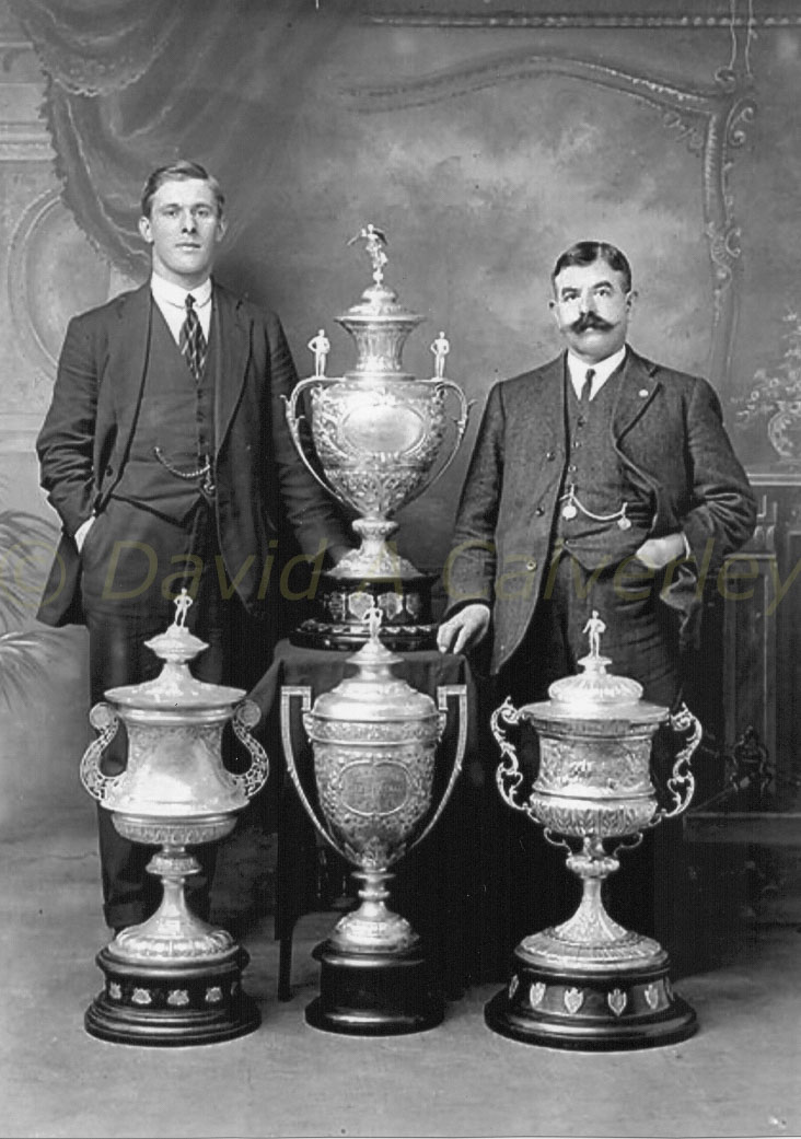 Harold Wagstaff (captain) and Albert Bennett (trainer) with all four cups 1914-15